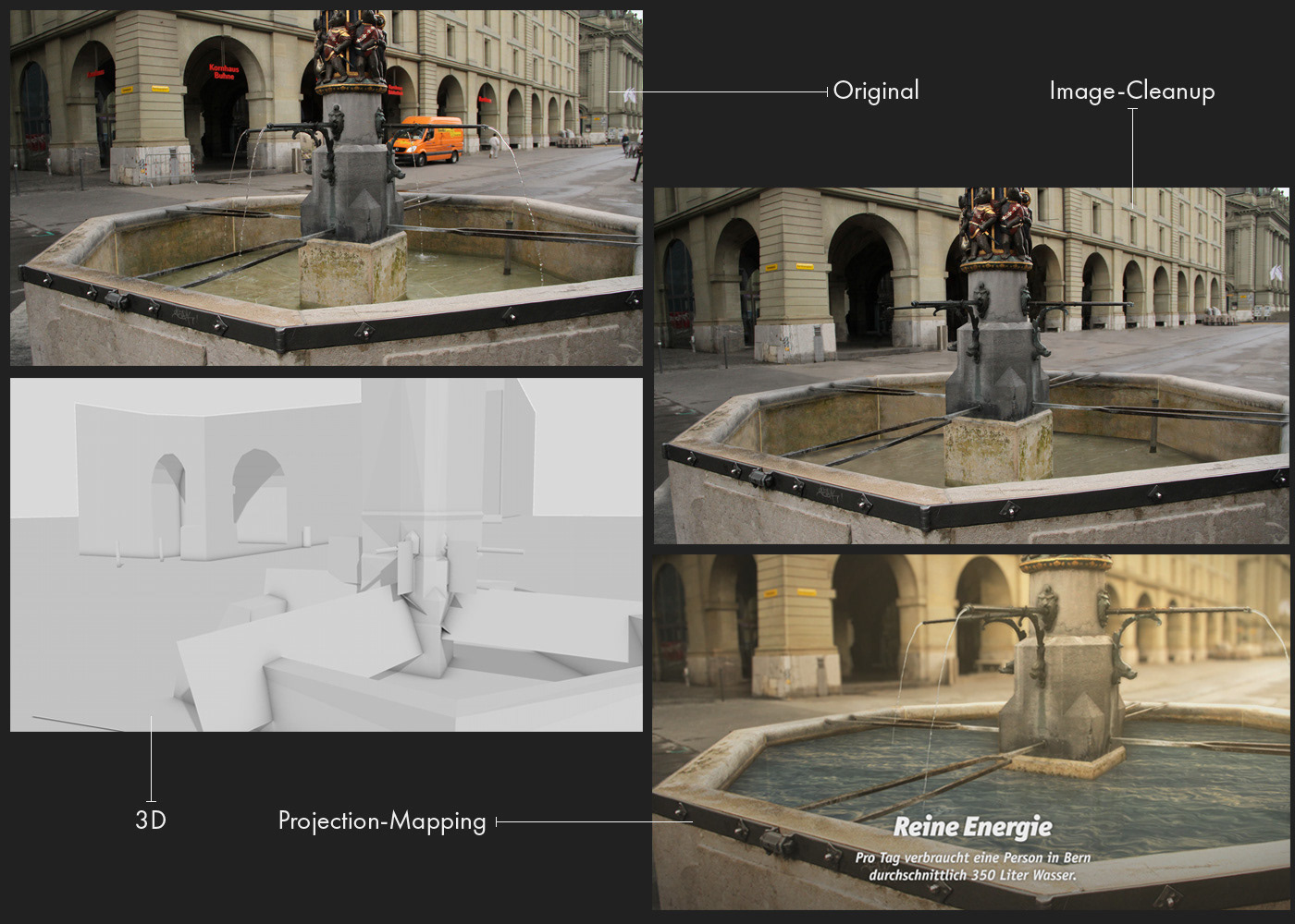 The idea was to produce a video to visualize the range of services the EWB provides. For this we took pictures of objects representig the service. We then cleaned up the image, cut it apart, rebuilt the structures in 3D and projected the image on them. This way we could animate a cameramove without having to actually record footage.